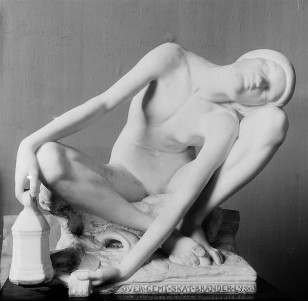 Carl Aarsleff created The Prodigal Son in marble, a material closely associated with classical sculpture. Marble carries a cultural weight, and the prodigal son is part of this tradition. It's hard to imagine this subject rendered in another medium. But while marble is associated with timelessness, the process of carving is extremely time-consuming, demanding skilled labor. Aarsleff would have transferred his design onto the block, then used a variety of tools—chisels, rasps, and abrasives—to gradually reveal the figure within. The figure's smooth skin and flowing hair contrast with the rough-hewn texture of the rock he sits on. The weight of the stone is impossible to ignore. That contrast draws our eye to the figure's slumped posture, emphasizing his emotional state. The heavy stone can symbolize his guilt, his regret and the weight on his soul. By considering the amount of work involved in the production process, the piece creates a dialogue between classical form and the realities of labor, challenging the traditional distinctions between fine art and craft.