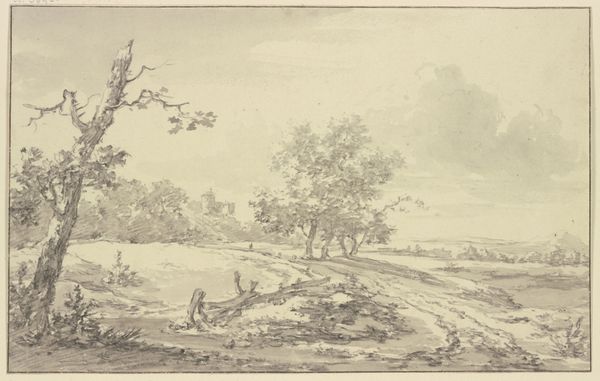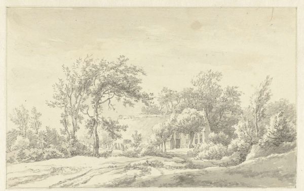 Curator: Jan Wijnants crafted this pastoral scene using chalk, graphite, and ink. The artwork, presently housed in the Städel Museum, goes by the title "Kapelle und ein Bauernhaus unter Bäumen, dabei einiges Vieh, rechts am Rande zwei Hirten." Editor: It feels like looking at a fading memory. The tones are subdued, almost monochromatic. A lone chapel on the left, contrasted by the larger farmhouse nestled amongst the trees – there’s a simplicity here, but also a strong sense of place. Curator: Consider Wijnants' approach. The texture is palpable, rendered with visible strokes of graphite and ink that delineate the material world around the village structures. Think of the physical act of surveying this landscape, selecting his materials, rendering this world under particular economic conditions of patronage... Editor: Right. This wasn’t a scene of neutrality. Even landscape is coded, carrying hierarchies within. The inclusion of the chapel alongside the farmhouse signals a community rooted in both labor and spiritual practice. Where does the control lie for the landscape – with the grazing livestock or God? Curator: Good point, the choice and handling of materials offer valuable insight. Chalk for subtle gradations, ink for delineating details - Wijnants seems to draw a hierarchy. Editor: These pastoral images also offered solace amidst upheaval. Seventeenth-century Dutch society was changing – we can question what these tranquil village scenes affirmed for their buyers and contemporary audience. Curator: Precisely! The method is so important. His technical skill translated nature itself into a commodity, to be traded and displayed, reinforcing human dominance of natural world, as material to build both home and art. Editor: There’s a quiet dignity in this sketch; this is something special and of its time. Considering issues such as human labour of livestock, the way that this period influenced art can provide great context for modern culture. Curator: Definitely. Understanding the socio-economic factors which birthed this landscape, combined with material understanding makes appreciating its cultural relevance so rewarding! Editor: Absolutely. A valuable lens into how art interprets the world we create – then, and now.