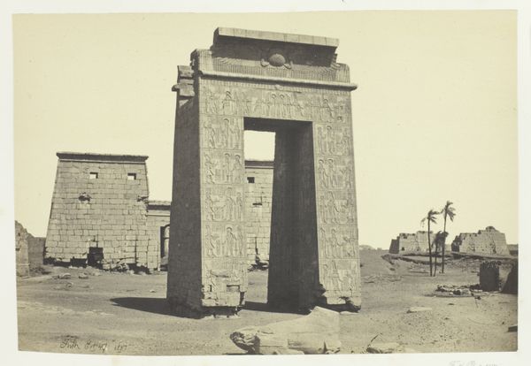 Robert Murray created this photograph of the Gate of Ptolemy Philomeder in Karnac around 1880, using a process that was still relatively new at the time. Photography, like many crafts, is a delicate balance of technical skill and artistic vision. The sepia tone of the print speaks to the specific chemistry involved: silver salts on paper, carefully exposed to light, and then developed to bring out the image. This was a labor-intensive process, requiring not only knowledge of the materials but also patience and precision. Murray's choice to document this ancient gate is significant. The monumental stone structure, with its intricate carvings, speaks to the immense labor and skilled craftsmanship of the ancient Egyptians. By capturing it through the relatively new medium of photography, Murray bridges two distinct eras of material culture, inviting us to reflect on the enduring power of human creativity across time. This photograph reminds us that every image, like every object, is a product of specific materials, processes, and social contexts.