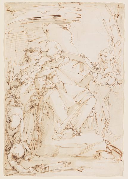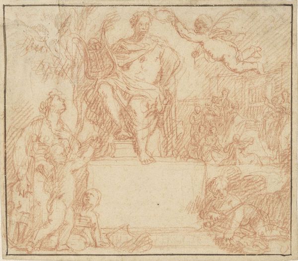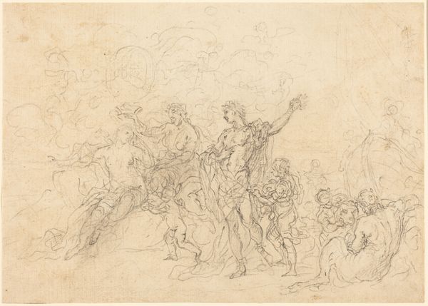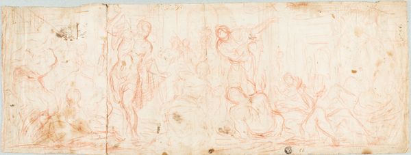 Curator:Good morning. Editor:This drawing, entitled "Mythological Composition with Chronos and Harpies", is a figural sketch by Giovanni Battista Cipriani rendered in a reddish medium. I immediately notice the dynamic lines and energetic composition. How do you approach an interpretation of this Baroque work? Curator:Primarily, through a careful study of its formal qualities. Note the strategic deployment of line – how it defines form yet remains open, suggestive of movement. Cipriani manipulates space through layering and overlapping, creating depth without resorting to traditional shading techniques. The monochromatic palette focuses attention on the linear structure and the interplay of positive and negative space. Do you see how the dynamism and imbalance serve the visual narrative? Editor:Yes, definitely. The lines really create movement and emotion. The lack of shading pushes my eyes to notice the artist's hand and thought process as they conceived the artwork. What are some of your insights? Curator:I interpret the tension as an allegory. Can you identify a sense of disruption, both in the figural arrangement and the sketchy marks, or perhaps notice a discord, like musical dissonance, that may be key to a fuller reading? Editor:That's insightful! I hadn’t thought of it that way before, but that artistic choice makes complete sense, pushing beyond the mere aesthetic surface into conceptual communication. Curator: Precisely. A detailed assessment and appreciation is the best method for interpreting artworks and understanding their artistic value.