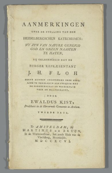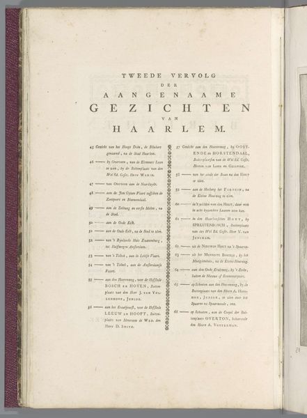 Curator: Here we have "Omslag voor de prenten bij een boek van Rhijnvis Feith," a work from 1786 by Elwe & Langeveld. It’s a print on paper and textile, held at the Rijksmuseum. What catches your eye initially? Editor: Well, besides the obvious, the fact that I cannot read most of this early Dutch... I’m struck by the list-like structure and all-caps typography. It lends it a sense of authority and… proclamation? Though proclamation might be too strong. Curator: Yes, consider this as a kind of title page or even a proto-advertisement. It highlights key themes, episodes, and, most enticingly, emotional payoffs from the book for which the prints were made, Rhijnvis Feith’s “Julia.” Notice how “Kunstplaaten” or “Art Prints” is centered. Editor: “Julia…” Given the era, one imagines there’s a heavy dose of sentimentality, romantic distress, and possibly tragic female virtue at play. I also see “slavernij” and… could that possibly mean…slavery? Curator: Aha, your contextual awareness picks up what the surface doesn’t reveal immediately! It's very easy to reduce historical ideas and expressions of sentimentality to a joke now. It’s crucial that the text promises illustrations for moments titled “The Meeting”, “The Unfortunate”, and other emotionally charged episodes within the book’s narrative. Editor: And this "ordinary" paper it’s printed on. It seems rather precious now. It's such a self-aware advertisement, almost postmodern in how brazenly it seems to manipulate potential readers. Is it successful in generating our interests still after all this time? Curator: Perhaps! We’re talking about it, aren't we? As an object carrying a record of a particular period of readership and reception. The price listed at the bottom really underlines the intended audience. It creates an expectation for people with means to feel, but it opens so much conversation around historical constructions of feeling and value in art and life. Editor: Indeed! This single sheet encapsulates so many threads about commodification, cultural values, the control of emotional responses… and it gives you that historical taste that’s almost melancholic. Curator: For me, its graphic clarity and promise of visual supplements underscore art’s lasting appeal through emotionally potent iconography, as we respond to archetypes and symbols across vast time.