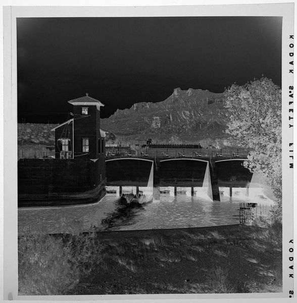 Curator: This evocative image, currently entitled "Untitled (irrigation canal coming out of dam with desert in background)", is by Jack Gould and resides here at the Harvard Art Museums. Editor: Wow, it's moody. The stark contrast creates this almost gothic feel, like a still from a silent film about a hidden, secretive place. Curator: The drama in the image could speak to the historical importance of irrigation in the American West, controlling water became a matter of political and economic power. Editor: Absolutely. The dam, these severe, geometric shapes, dominate the landscape. It feels like nature is being forcefully controlled here. Curator: It’s a fascinating snapshot of a moment in time, one that highlights the intersection of nature, technology, and human ambition. Editor: It does. It's a stark reminder of our attempts to manage the natural world, and the strange beauty that can sometimes emerge from that tension.