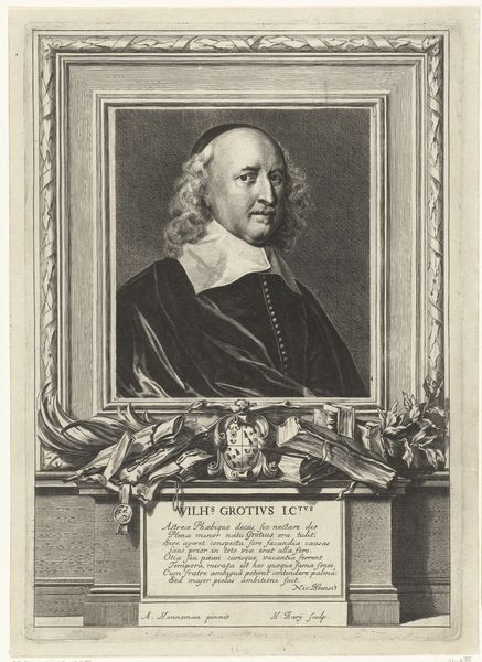 Johann Borcking rendered this portrait of Wilhelm Albrecht, Reichsgraf von Kolowrat-Krakowsky, as an engraving. The composition is dominated by an oval frame that encloses the figure, immediately drawing our attention to the Count's dignified presence. Borcking masterfully uses line and texture to create a sense of depth. The portrait is meticulously crafted, employing hatching and cross-hatching to model form and suggest the play of light on fabric and skin. The texture of the Count's fur collar contrasts with the smooth surfaces of his face and the ornate lace of his collar. These elements contribute to the overall characterization of the Count as a man of status. The inclusion of heraldic symbols below the portrait anchors the image in a specific cultural context. By analyzing Borcking's formal choices, we can start to understand the values and the power structures of the time. Remember that art does not have a single meaning but invites ongoing interpretation and re-interpretation.