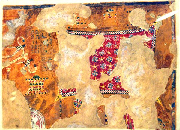 Editor: Here we have Nicholas Roerich's 1913 watercolor, "A guy who plays the horn." The fluid lines and soft colors give it a dreamlike quality, and the subject appears almost weightless. What stands out to you in terms of form and composition? Curator: Initially, observe the restricted palette. Roerich’s careful selection limits visual chaos. Consider also the strategic distribution of texture: wispy curls versus the solid blocks of the horn. How does this interplay affect your understanding of depth within the pictorial space? Editor: It flattens the image, doesn’t it? The figure and background seem to merge, emphasizing the decorative quality over realistic depth. It also draws my attention to the patterns in his clothes and the horn. Are those significant in any way? Curator: Precisely. Notice how the repetitions, though stylized, provide a rhythmic structure, echoing the musical instrument’s purpose. Roerich skillfully uses the verticality of the figure to bisect the visual plane, contrasting with the horn's horizontal projection. How does the color contribute to this sense of balance and imbalance? Editor: The splashes of red in his hat and hair add visual interest and contrast with the otherwise muted palette. This keeps my eye moving, not settling anywhere for long. Curator: Exactly. Note also the negative space. Roerich uses it intentionally, directing your gaze and shaping your perception. This, coupled with a focus on pure aesthetic qualities such as line, shape and color, rather than a representational narrative, shifts our focus toward artistic interpretation. What are you left pondering? Editor: I’m left thinking about how deceptively simple it looks, while its composition is carefully constructed, highlighting form and texture to guide the viewer's experience. Thank you for sharing these observations! Curator: My pleasure; visual art rewards prolonged study, and offers fresh insights with each observation.