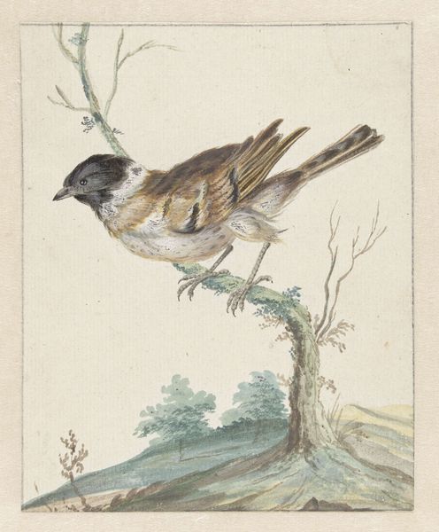 Curator: Our attention is drawn to a delightful watercolor and possibly colored pencil drawing titled "Lazuli Bunting," created by Jan Weenix sometime between 1670 and 1719. Editor: Its fragility strikes me first; that pale wash and delicate line work speaks of fleeting beauty, like a memory caught on paper. Curator: Weenix's choice of medium is key. The watercolour allows a lightness that mimics the bird itself, conveying a sense of its weightlessness, its connection to the natural world from which the materials themselves are extracted. It avoids the preciousness associated with oil paint, thus elevating the status of these natural objects as worthy of art. Editor: Precisely! And beyond that fleeting beauty, the lazuli bunting itself bears a symbolic weight. The colours are incredibly evocative. Blue for contemplation, the yellows perhaps alluding to joy or sunlight – a tiny, feathered beacon of hope. Curator: It’s a commentary on material constraints, right? He worked within the limits of available pigments. What colors could be reliably sourced from local materials, influencing not only the composition but the visual rhetoric itself? Editor: The bird gazing upwards suggests aspirations beyond its grasp. A longing perhaps for something greater. There's almost a human-like quality to the bird's posture, giving it the symbolism of human's striving towards the Divine. Curator: In terms of labor, this wasn’t simply capturing nature. It's part of a cycle: raw materials become commodity. The pigments were produced, bought and sold, turning a bit of the earth into currency, and thus weaving nature inextricably into commercial practices. Editor: A thought that lends gravity to something as seemingly delicate as watercolour on paper. Curator: Seeing through an economic lens, Weenix gives value to that bit of nature by framing the materiality, revealing social dynamics that imbue even simple objects with new life and symbolic worth. Editor: A captivating insight indeed, showing this small bird represents an entire cosmos. Curator: So we’ve arrived at a deeper understanding by exploring production chains that brought pigments into being, haven't we? Editor: It's all a part of how cultural narratives take flight.