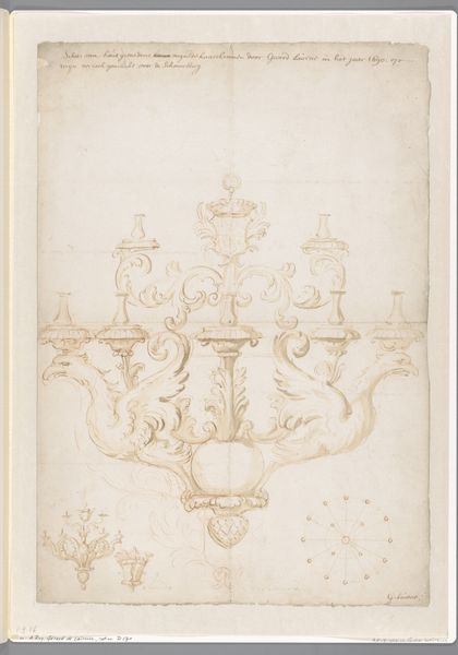 Editor: This is "Design for the Stucco Decoration of a Rococo Ceiling," a pen and ink drawing by Johann Oktavian Salver, from around 1755. The elaborate, swirling forms look incredibly detailed. What strikes you about it? Curator: What strikes me is less the “what” and more the “how”. Think about the material conditions that made this design possible. The quality of the paper, the ink, the artist's tools – even the light in his studio. Editor: I hadn’t thought of it that way. Curator: Rococo was about ostentatious displays of wealth. This drawing is a commodity itself, yes, but it’s also a plan for further production – the stucco ceiling. Who were the artisans who would execute this design? What were their working conditions? Their pay? The Rococo style became ubiquitous throughout Europe, what does its popularization mean? Editor: So you’re saying we shouldn't just admire the artistry, but consider the social and economic systems that made it all possible. The access to materials, and labor? Curator: Precisely! Where did Salver get his ink? How was it made? What was the societal role of decorative plasterers at the time? Those who consume art often do not give much thought to those who labored and gave art life with their own hands. These designs were never intended to be viewed simply as aesthetic objects – it misses the intent behind the construction. Editor: I see, focusing on the means of production gives a totally different meaning. Thank you for broadening my perspective. Curator: Indeed. And it allows us to truly appreciate, I think, not just the artistry, but the complex web of human effort embedded within.