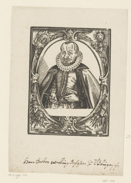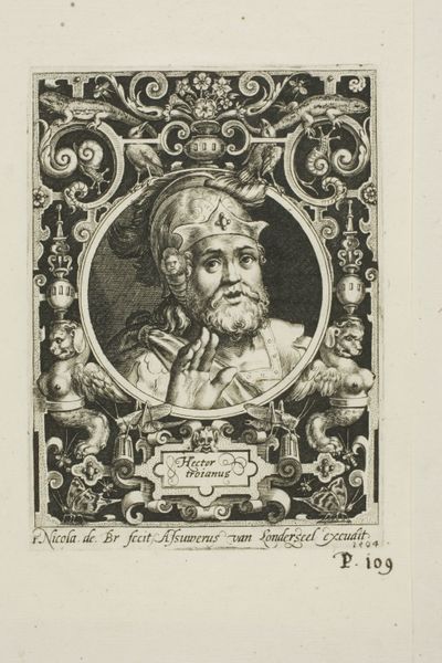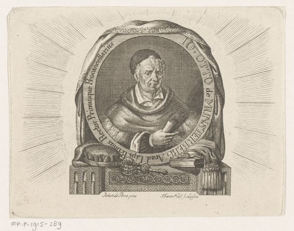 This is a portrait of an unknown man made in an engraving by an anonymous artist. The subject is framed within a circle teeming with cherubic figures and grotesque masks, creating a visual tension between the classical and the uncanny. Observe how the circular composition serves not only to isolate but also to elevate the sitter, drawing immediate attention to his steady gaze. The detailed cross-hatching technique gives volume to his garments and face. The arrangement of figures around the perimeter isn't merely ornamental; it is a structural device that both contains and contrasts the stillness of the central figure. The juxtaposition of sacred and profane imagery suggests a deeper exploration of human nature. Here, the rigid framework of the portrait challenges fixed meanings. The work functions as a site where aesthetic beauty and philosophical inquiry meet, inviting ongoing interpretation and re-interpretation.