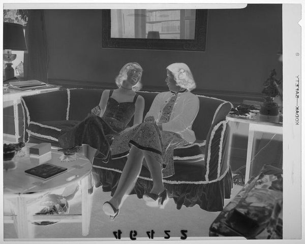 Editor: This is an untitled photograph by Martin Schweig, featuring a woman in a formal dress. The high contrast really draws my eye to the material of her gown. What strikes you about this piece? Curator: Notice the backdrop – bedroom furniture, striped chaise lounge, even the woman's dress. It all signifies the manufactured image of postwar domesticity. How does the photographic process itself, the darkroom labor, shape your understanding of this curated presentation? Editor: So, the photo itself becomes a commentary on constructed ideals? That's fascinating. Curator: Exactly. It asks us to consider the labor and materials involved in creating and consuming these images. We must think about the conditions behind their production. Editor: I'll never look at a seemingly simple photograph the same way again!