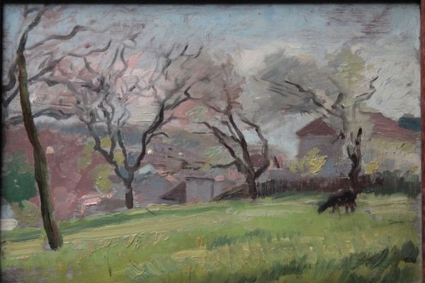 Piet Mondrian made this painting of a farmyard in the Gooi area with oil on canvas, though we don't know exactly when. Look at how he builds the scene with these energetic dabs and strokes, a real hands-on, physical process. Up close, you can almost feel the thickness of the paint, especially in the foliage. It’s like he’s sculpting with colour, not just painting, which gives the whole scene a vivid, almost tangible quality. Notice how the greens and browns aren’t just flat - they shimmer with light, thanks to the varied brushwork. The way he's captured the light filtering through the trees reminds me of some early Fauvist landscapes. That little white and black shape tucked away to the right; I think that’s a cow! It’s a detail that suggests something of the daily life of the farm, adding a layer of narrative into the mix. Mondrian is famous for his later geometric work, but paintings like this remind us that art is a journey, a conversation, and that artists are always exploring, experimenting, and feeling their way forward.