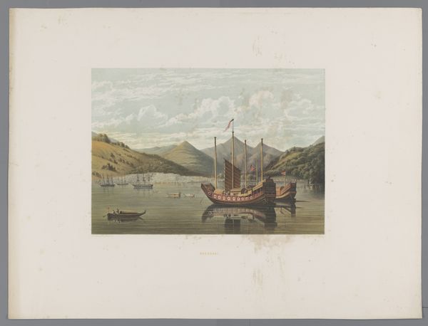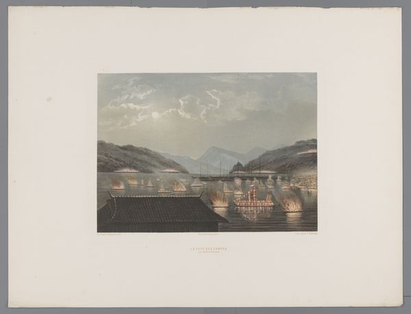 This print depicts a view of Nagasaki Bay and was created by an anonymous artist. The composition is structured around a serene horizontal arrangement where the dark foreground of a building's roof meets the tranquil expanse of the bay. Notice how the artist employs a limited palette of muted greens, greys, and blues to evoke a sense of calm and distance. This choice softens the forms and creates a unified visual field. The dark foreground of the roof anchors the composition, providing a stable base from which the eye can travel into the receding planes of water, mountains, and sky. The use of perspective is subtle, but the diminishing size of the boats and the haziness of the distant mountains create a sense of depth, drawing the viewer into the scene. The artist's technique emphasizes a balance between detail and abstraction, capturing the essence of the landscape rather than a precise representation. It invites us to contemplate the scene as both a visual experience and a constructed image.