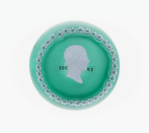 This paperweight was crafted by the New England Glass Company, which operated from 1818 to 1888. Encased in translucent green glass are the profiles of a woman and a man, likely depicting a prominent couple of that era. During the 19th century, paperweights like this one became fashionable objects in middle and upper class homes, reflecting a burgeoning culture of both industry and domesticity. They often featured romantic or patriotic symbols, and the likenesses of historical figures. This paperweight offers a glimpse into the era's fascination with celebrity and status. Who were these people rendered in glass? Perhaps, like the paperweight itself, these figures served as reminders of the powerful and wealthy. Contained in glass, the figures are frozen and flattened, devoid of complexity. The glass paperweight transforms private identity into public display.
