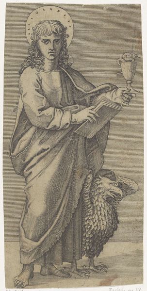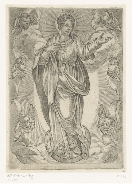 This is an engraving of Saint Juliana of Nicomedia, made by an anonymous artist, that can be found here at the Rijksmuseum. The print presents a striking contrast in its composition. The saint is depicted with smooth, flowing lines, haloed and serene. The devil, lurking behind her, is rendered with sharp, jagged lines and a sinister expression. This juxtaposition is not merely decorative; it’s a structured dialogue between good and evil, rendered through line and form. Notice the saint's gesture, she is holding a drape as if she is about to drop it. This formal device may be interpreted through a semiotic lens. Here, the image engages with the concept of unveiling, challenging fixed meanings and inviting us to reconsider traditional interpretations of virtue and vice. The artwork doesn’t just depict a saint; it poses questions about the nature of belief and the very act of seeing.