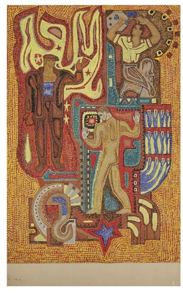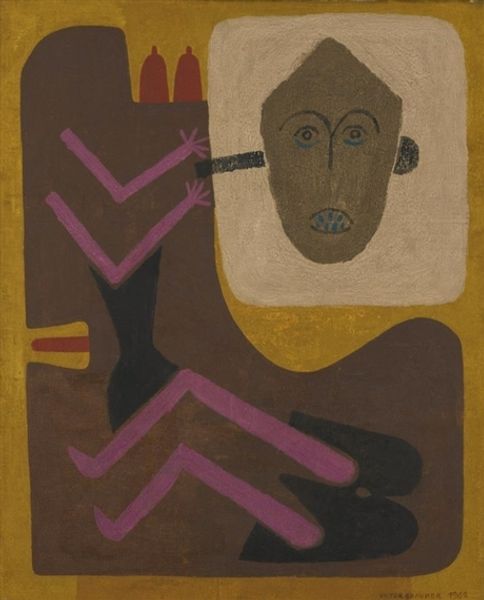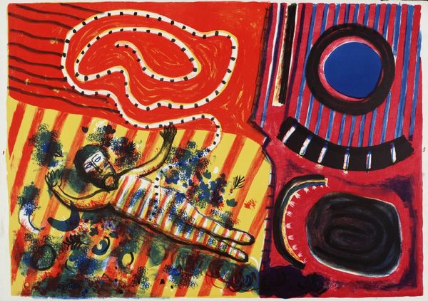 Curator: Alright, let's delve into this intriguing piece titled "Indian Motif" crafted by Abraham P. Hankins in 1945. It's a woodcut print displaying elements of modernism. My initial impression focuses on its surprising flatness despite the complexity of shapes. What grabs your attention right away? Editor: I’m immediately struck by the bold shapes and earthy color palette. There is this striking flatness you mention, like stacked visual ideas fighting for prominence on one visual plane. But let’s talk about the “Indian Motif” element... Do you think Hankins was trying to tap into an ideal of Indigenous culture, or more likely, co-opting it for a Modernist aesthetic? Curator: It’s tough to say definitively without delving deeper into Hankins's background. The 1940s was a period marked by increasing social consciousness, alongside the rise of the abstract and Modernism's growing embrace of primitivism. I believe it’s more likely Hankins was drawing upon this broad "exotic" theme prevalent in those years, albeit filtered through his artistic lens, revealing a nuanced take of cultural fascination, perhaps tinged with misinterpretation. How would you see his handling of material, his application of modernist principles in that context? Editor: Looking at the print itself, the woodcut medium brings such beautiful texture, the slightly uneven inking, with some areas heavier, and others letting more of the paper through, brings a feeling of crafted object. Compositionally, you've got this all-over design, so there’s no single focal point. These visual motifs are carefully calibrated for their design—note that he's less invested in literal translation. What’s more, he seems preoccupied with purely formal aspects of his art making: balance, contrast, color harmonies within the visual field. Curator: Indeed. By titling it "Indian Motif," Hankins places this work in conversation with ongoing issues, which can spark important debates. The role of cultural representation, who gets to represent whom, and how is Modernism contributing or not contributing to a wider dialogue... Those considerations open rich interpretative avenues. Editor: Agreed. I would like to reiterate that while cultural interpretation is extremely relevant, we also have to consider the semiotic and compositional makeup that ultimately produces visual enjoyment. All of these perspectives work together to create an ultimate aesthetic effect for a piece such as this one!