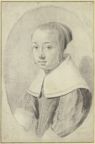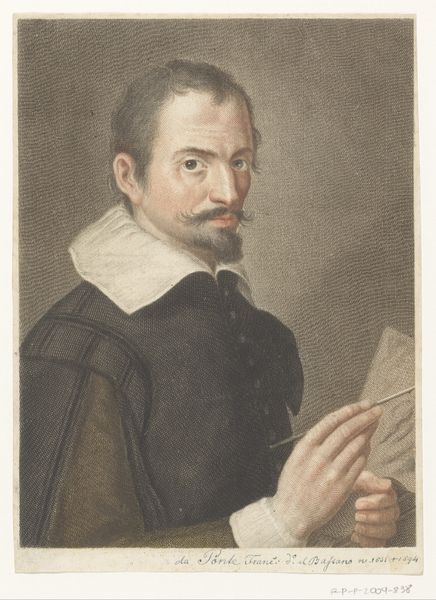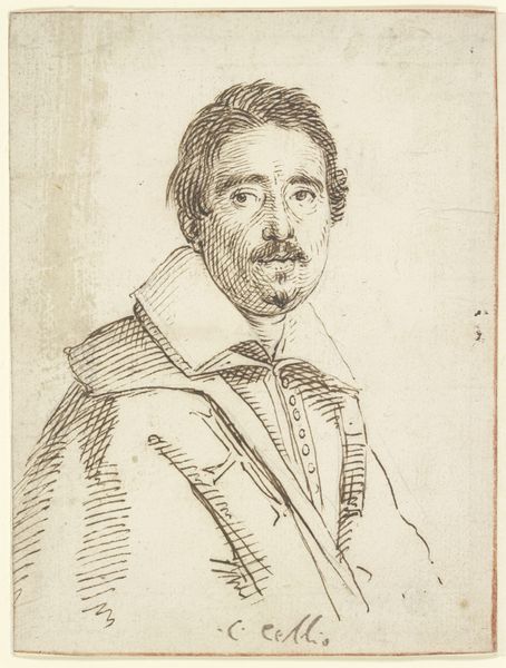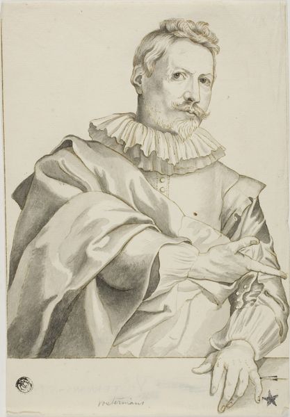Editor: We’re looking at "Bust of a Gentleman," a red-chalk drawing from 1622 by Ottavio Leoni. It's housed at the Städel Museum. I’m struck by the texture. The paper seems almost to absorb the chalk, creating a soft, almost ethereal quality. What catches your eye about it? Curator: The work’s formal strengths lie in its rendering of texture through subtle gradations of light and shadow, achieved masterfully with red chalk. Note how the artist employs hatching and stippling to define the volume of the figure, particularly around the ruff and face. Do you perceive how this creates an interesting tension? Editor: Yes, the ruff seems to be almost a separate entity from the gentleman! Is this use of light and shadow typical for Baroque portraiture? Curator: Indeed, Baroque art favors dynamic compositions and dramatic use of light, which we observe here in the modeling of the face and the stark contrast between the figure and the toned paper. However, consider the formal vocabulary. The artist is making a statement about status via costume, but also about the power of representation and artistic ability via its detailed features and realistic execution. Can you see it now? Editor: I think so! I’m noticing the meticulous detail in the rendering of his mustache, too. It gives a very strong character. Curator: Precisely. The sum total—color palette, texture, shading—constitutes an image that speaks not just to likeness, but to presence. This emphasis aligns perfectly within the Formalist project: attention to formal elements and techniques employed rather than on what those features represent. Editor: That's given me a fresh perspective! Now, I appreciate Leoni’s attention to composition and light. It’s definitely more than just a picture; it’s an exploration of form.