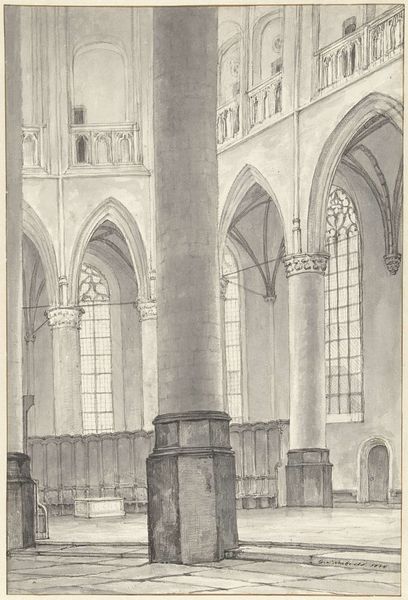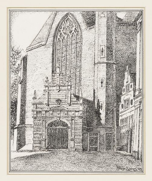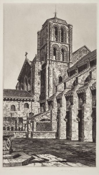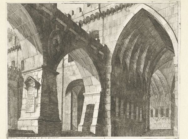 Curator: Right, let's have a look. This is "Part of a Monastery at Utrecht Cathedral" by Jozef Hoevenaar. It’s an etching and engraving printed somewhere between 1850 and 1926. Editor: It has a melancholic feel. That very precise, almost brittle linework captures the grandeur of the architecture but also this profound sense of time and…decay, almost? Curator: I see what you mean. It's the sharp realism mixed with those strong Gothic lines, right? I always find something compelling about the contrast, how light and shadow delineate form with such clarity, emphasizing the enduring strength within. Editor: The pointed arches reaching to the heavens. That visual language speaks of spiritual aspiration, but in Hoevenaar’s hands, it feels somehow... heavier. Are these forms a testament to faith, or just reminders of mortality, slowly consumed by time? Curator: Good point. Those architectural details are all working together—arches, lines, perspectives—to explore form, but also something much bigger. What strikes you about the recurring arches and repeating geometric shapes? Editor: The arches definitely frame and echo ideas of portals. What do we access when walking through one? To the unfaithful, only an edifice, but for others, something much grander, with light that pours down and transforms the simplest of mortals. The symbolism of the soaring Gothic—it can never be just structure, can it? Curator: Exactly. Though captured so meticulously, down to the very last brick it almost feels like, in essence, it speaks volumes. This piece encapsulates centuries of cultural memory, rendered in these quiet, delicate lines. A narrative etched not just into paper, but into time itself. Editor: Ultimately, this reminds me that architecture has always told tales. It’s more than mere function. Here, it’s a dance between what crumbles and what remains eternal in the human spirit.