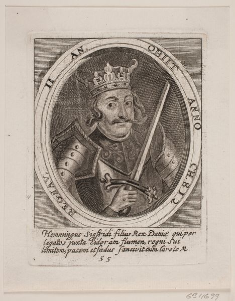 Giuseppe Maria Testana created this portrait of Camillo Astalli-Pamphilj as an engraving. The composition is dominated by the oval frame which encloses the cardinal's likeness, immediately drawing our eyes to the central figure. The texture of the print is achieved through fine, precise lines that define the form and create a sense of depth. These marks form a semiotic system of signs which point beyond the mere representation of a man. Look at the two crests in the upper left and right corners: they suggest power and status. The oval frame is a traditional form, yet its usage here serves to isolate Astalli-Pamphilj, underscoring his individuality while simultaneously placing him within a lineage of notable figures immortalized through portraiture. This tension between the individual and the institution is crucial, hinting at complex power dynamics at play. The artwork invites us to consider the structures of representation and the cultural codes embedded within artistic forms.