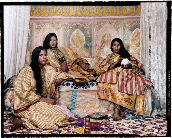Lalla Essaydi created “Harem #35”, a photograph, in an unknown year. The composition immediately strikes us with its opulent display of colors, patterns, and textures, evoking both a sense of luxury and a complex visual tension. The figures are adorned with fabrics that blend into the backdrop, challenging our perception of space and depth. Essaydi uses the semiotic language of the harem, a space traditionally associated with seclusion and orientalist fantasies, and subverts it by inscribing Arabic calligraphy, a symbol of knowledge and power, onto the women's skin and garments. This act destabilizes established meanings, transforming the women from passive objects of desire into active participants in their own representation. The repeating patterns and the flattening of perspective deny a single, fixed viewpoint. Instead, Essaydi offers a space of multiplicity and fluidity. The photograph functions as a site for ongoing interpretation, where the aesthetic and the conceptual intertwine. It invites us to reconsider the interplay between tradition, representation, and female agency.