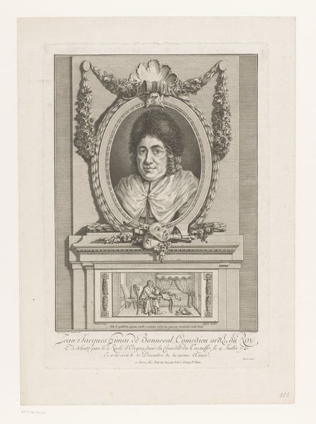Curator: This print, dating from between 1758 and 1804, depicts Henry Louis Zekain. It’s an engraving by Jean-Baptiste Michel and is currently held at the Rijksmuseum. What's your initial impression? Editor: Oh, striking! There’s something wonderfully theatrical about it. Melancholy, even, despite all the ornamental flair. Like a fading star clinging to past glories. Curator: It's intriguing how you read "melancholy". This piece, as an engraving, involved a significant labor process, moving from Michel's design to the skilled hand etching the copper plate. Consider the economics; such prints made portraiture more accessible. Editor: I suppose. It makes me think about stagecraft, though—the costume, the drama captured in a single frame. It’s interesting how the rigid, formal engraving style actually amplifies the theatricality, pushing it towards caricature. Almost poking fun while trying to commemorate. Curator: The "caricature" element you pick up on touches upon the subversive potential within seemingly formal portraiture. These prints circulated widely; influencing ideas about status, representation and power, as well as creating a visual archive of prominent figures of the era. Editor: Right, they played this pivotal role! The framing details add this fascinating layer – I am especially drawn to that small tableau underneath his portrait depicting what appears to be a scene from classic tragedy. I almost feel I’m getting the highlights reel here. Curator: Precisely! These details are essential; reinforcing Zekain's theatrical persona and alluding to the dramatic roles through which he rose to prominence, cementing the constructed persona in a way quite unique for a portrait made via such mass produced, affordable print technology. Editor: So, in a way, it democratized the elite persona while ironically preserving the distance? Makes one wonder, though, what Zekain himself thought of this depiction. A poignant snapshot caught between the footlights and mass production! Curator: A beautifully framed consideration! Yes, thinking about its reception allows a fresh perspective on art history. Editor: It’s always worth that moment to remember those individuals who became the visual markers in history and the ones responsible for documenting it all, right?