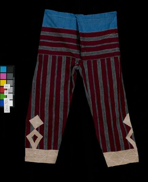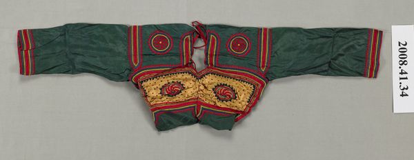 This jacket, made by an anonymous artist, showcases a striking contrast between the red fabric and the complex white embroidery. The embroidery arranges geometric forms into vertical lines that give the jacket structure. The horizontal format of the jacket, emphasized by the broad collar, counters the linear details with a static quality. The formal interplay between surface design and functionality is fascinating. Note how the embroidery, while ornamental, also appears to serve a structural purpose, reinforcing the shape of the garment itself. This fusion of decoration and utility destabilizes established meanings of dress, asking us to reconsider the function of clothing beyond mere covering. Consider the semiotic system in play here; the red color might symbolize power or status, while the geometric patterns could represent specific cultural codes. Ultimately, this jacket invites us to interpret how clothing can communicate ideas and cultural values.