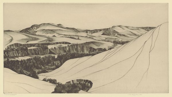 Editor: This is "Dunes near Palm Springs, California (no.2)," an etching done around 1934 by George Elbert Burr. It's really striking how he captures the immensity of the desert with such delicate lines. What do you see in this piece, especially considering the time it was made? Curator: I'm immediately struck by how Burr utilizes light and shadow to evoke the desert’s silence. Dunes have always been a potent symbol – consider their association with pilgrimage, barrenness, and spiritual questing across various cultures. Does the repetition of the dunes evoke a particular emotional state for you? Editor: Definitely a sense of solitude, maybe even a little lost. The dunes almost seem to go on forever. Is there any particular historical context that influences your interpretation of those symbols? Curator: The 1930s was a period of great social and economic upheaval, marked by the Dust Bowl in America. The landscape in this print perhaps echoes collective anxieties about loss and the fragility of life. Burr is not simply depicting a scene, but reflecting the cultural anxieties of a nation. Look at the mountains looming in the background; what feelings do they suggest? Editor: I guess they provide some grounding amidst all that shifting sand. A reminder that even in the harshest environments, there's something constant and enduring. I wouldn’t have picked up on those connections initially. Curator: It's fascinating how visual symbols can tap into our cultural memory. How an image of a desert, for instance, isn’t simply a landscape but a repository of collective human experiences and meanings accumulated over time. What will this image suggest to viewers in the future? Editor: I imagine those future viewers might also think of climate change and environmental fragility when seeing this landscape, adding new layers to its meaning. It really changes the way I look at art when I consider the symbols within the cultural context. Thanks for sharing that perspective! Curator: The image evolves through time, and it is exciting to witness this evolution and to uncover some of the hidden symbolic weight, too!