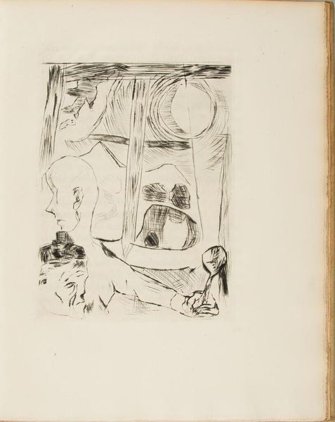 Curator: Max Beckmann, born in 1884, created this illustration for Chapter One of an unknown book titled "The Duchess." It's an etching, measuring about 29 by 22 centimeters. Editor: Striking. The raw, almost frenetic quality of the etched lines creates a palpable sense of unease. What narrative is Beckmann hinting at here? Curator: Well, examining the materials and process, the very act of etching allowed Beckmann to create these dense crosshatching effects. It’s through that process that the figure emerges from the shadows. Editor: Precisely! The Duchess's implied status, set against the backdrop of Weimar Germany, begs questions about gender, class, and power in a society on the brink. Is this a critique? Curator: Perhaps it speaks to the socio-economic precarity of the era, reflected even in the scarcity of line and detail. A comment on the means of artistic production itself, reflecting a society struggling with its own production. Editor: It makes me consider the Duchess as a symbol of fractured identity, a commentary on the superficiality of privilege amidst social turmoil. Curator: Interesting, I was looking at the work as a demonstration of the artist’s skill in using relatively spare means to such dramatic effect. Editor: It's amazing how different perspectives can enrich our understanding, isn't it? Curator: Indeed. The technical execution is impressive, even as the social commentary provokes thought.