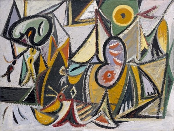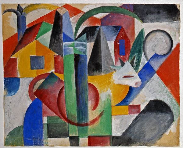 Editor: Here we have Patrick Henry Bruce's "Composition V" from 1916. It is an oil painting, and the shapes and colors are quite striking. It feels almost chaotic in its arrangement. How would you interpret this work, focusing on its formal elements? Curator: The painting presents a fascinating study in contrasting forms. Notice how Bruce employs geometric shapes, circles, rectangles, triangles, which vie for space on the canvas. The color palette—primarily reds, blues, greens, and blacks—is bold, creating a sense of tension and dynamism. How do you perceive the relationship between these color choices and the overall structure? Editor: I think the dark colors help define the forms and create some depth. Are those relationships accidental, or is Bruce aiming for something deeper than just presenting shapes? Curator: That's astute. It's less about external reference and more about exploring internal relationships. The brushstrokes, although seemingly haphazard, reveal a considered layering and blending. It is precisely this interplay that signifies its artistic endeavor—an inquiry into the potential for pictorial construction independent of representational obligations. We may even delve into Semiotics, where colours, brushstrokes, the geometric shapes serve as signifiers of emotions and ideas and challenge you, the viewer, to connect the various components of the painting together and formulate our unique interpretations. What is your interpretation? Editor: I am trying to think about the colour composition now, maybe its his reflection on social events occurring at the time... The shapes are wrestling with one another to show their presence, that bold colour selection has even more weight than it would alone. Curator: A good reading; although subjective interpretations cannot be ruled out, they lie outside formal assessment. Do consider revisiting to assess how internal elements create a self-referential system divorced from time. Editor: Thanks; I realize I was drawn in by its colour. Thinking about colour is useful. I’m eager to reconsider it focusing more narrowly on his brush strokes now.