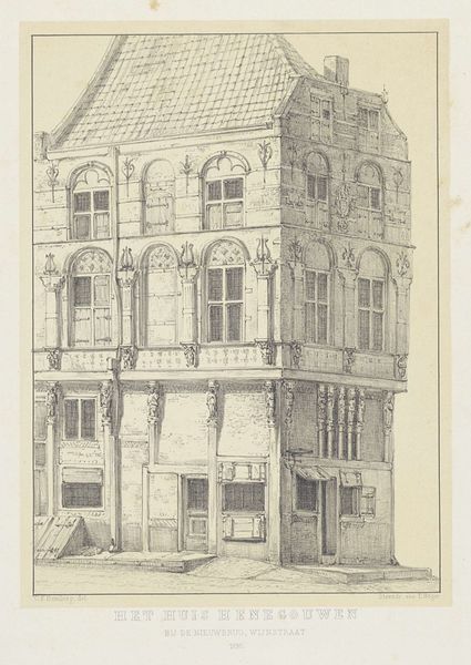 Curator: Welcome. We’re looking at Carel Frederik Bendorp’s etching from 1872, “Twee huizen op de hoek van een straat in Dordrecht,” or "Two Houses on the Corner of a Street in Dordrecht". Editor: It feels so precisely rendered, almost photographic. I am immediately drawn to the intricate linework, the clear geometric shapes of the buildings. It's so ordered. Curator: Indeed. Bendorp’s piece captures a moment in the urban fabric of Dordrecht. He produced this etching during a time of immense transformation in Dutch cities. Industrialization and urbanization were beginning to alter the traditional landscape. Prints like this played a role in documenting and preserving visual memories of this transformation. Editor: The architecture seems to speak of that period; you see this push-and-pull of grandiosity in the facades, against this muted palette and what feels like an honest record of these modest lives unfolding. It's fascinating how he contrasts textures using just line and tone. The aged stonework, against the smooth, shaded awnings… It really adds depth. Curator: Exactly. This etching offers a window into the cultural values of the time. Cityscapes such as this one would have held significance for the growing middle class, a display of local pride. It also reveals the influence of Realism as a dominant art movement focused on everyday subject matter and capturing modern life in unembellished ways. Editor: You know, for me it’s those contrasts, between the intricate upper stories, against what may be interpreted as humble street-level storefronts and doorways...it really speaks to the artist’s sensibility and his capacity to observe detail within a greater whole. Curator: Yes, it captures not only the architectural features, but offers an understated visual record about the people that once moved through this space. Editor: Looking at this etching more closely has given me an increased awareness of its visual artistry and its intimate portrayal of a period. Curator: Agreed. It provides an intriguing case study into the values and concerns of 19th-century Dutch society.