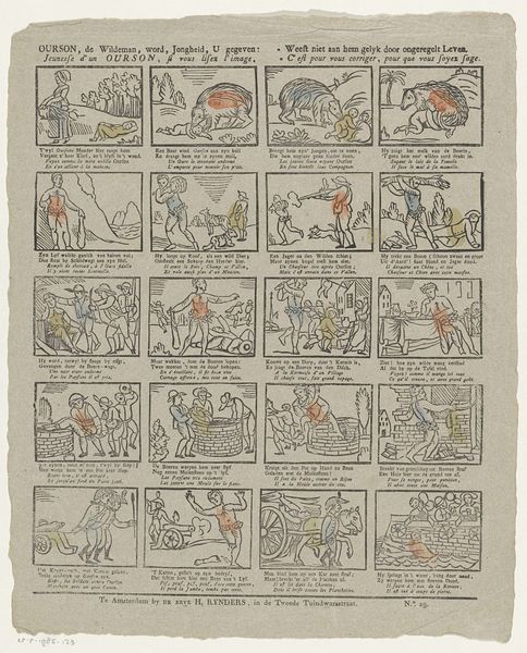 Curator: Look at this intriguing piece. "Kinderen! hier ziet gij van Speijk's roomrijk leven, daden en dood"—"Children! Here You See the Famous Life, Deeds, and Death of Van Speijk." It's an etching by C.C.L. van Staden, likely created sometime between 1830 and 1870. What are your first impressions? Editor: Well, it’s strikingly…didactic! The little sequential panels, the title itself…it feels very much like a moralizing children's book page. It also brings up ideas of national pride and myth building, probably focusing on ideas about what makes "good" dutch identity. Curator: Absolutely. The piece recounts the life of Jan van Speijk, a Dutch naval hero who blew up his own ship to prevent it from falling into Belgian hands during the Belgian Revolution. Note the stylistic choices – the rudimentary almost comic book aesthetic. This was clearly meant for a broad, perhaps even unsophisticated, audience. Editor: Exactly! Think about the socio-political context: the Netherlands, still relatively young after the Napoleonic era, attempting to solidify its national identity. This piece functions as propaganda, presenting a heroic narrative centered around sacrifice and devotion to the nation. Curator: We see images that convey very intimate ideas, scenes from Speijk's childhood and adulthood interwoven to produce a portrait of both devotion and violence, of life and death, that all amount to service to the "nation". It's using a specific event to solidify a vision of what it means to be a patriotic Dutchman. Editor: What's also crucial here, and in this museum’s mandate in particular, is considering how figures like van Speijk were remembered through imagery and how popular reception helped elevate figures to mythological status. I’m also interested in exploring, through contemporary lenses, the complexities and troubling undercurrents that glorifying such violent acts promotes. Are there parallels to current issues with regards to other such heroic myths around nation-building in a post-colonial, globalized world? Curator: Good questions to ask about historical prints that carry the weight of both patriotism and propaganda. These pieces are designed to promote conversations, which makes them relevant beyond their immediate moment.