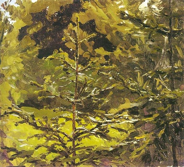 Curator: This is "Garden" by Denman Waldo Ross, currently residing at the Harvard Art Museums. It's an oil on panel, roughly 35 by 25 centimeters. Editor: It’s overwhelmingly green! A vibrant, almost dizzying array of greens, punctuated by small pops of pink and yellow. Curator: Indeed. Ross was deeply invested in color theory, and his application here feels almost scientific, experimenting with the possibilities of hue and value. Think about the cost of certain pigments during his time. Editor: And the framing! I'm also struck by how this piece might be read in the context of the Arts and Crafts movement, valuing the handmade and challenging industrialization. Curator: Precisely! The visible brushstrokes and the very deliberate layering of paint demonstrate a clear emphasis on process. Editor: It certainly gives us a lot to think about regarding the art world's relationship to labor and artistic expression. Curator: It's a fascinating insight into the values of the time and how they manifested in artmaking.