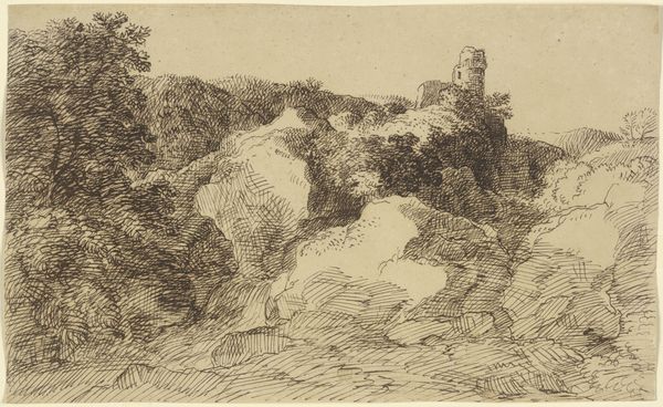 Curator: This is Arnoud Schaepkens' "Heuvelachtig Landschap," which translates to "Hilly Landscape." The artwork is an etching, and he worked on it sometime between 1831 and 1904. Editor: The lines are so precise. I'm immediately drawn to the foreground. There's a somber mood despite the natural subject. It feels a bit desolate, wouldn’t you agree? Curator: The use of etching lends itself to such moods, the details creating very intricate networks of light and shadow, emphasizing the solitude of rural life. This was a period that witnessed immense societal change as industrialization and urbanization gained ground; these themes resonate subtly. Editor: Exactly! And there is that tiny figure walking into the landscape. Their presence—or their isolation within this immense nature—hints at the impact of the broader economic forces displacing individuals. It isn't merely a passive, pretty scene. It has something more profound to say about humanity's place within nature during this era. Curator: Absolutely. When you examine the landscape genre during this time, a return to nature was more often than not, about romanticizing a pre-industrial world or signaling a social critique against increasing urbanization. Schaepkens was born in Rotterdam, and it’s no wonder he finds something to cherish in such environments. Editor: Right, the meticulous line work gives us a sense of the specific environment. There is an intimacy and perhaps even fondness toward the physical characteristics of that small hilly landscape, contrasting greatly with an era marked by displacement and change. What initially strikes you as pastoral becomes, on closer inspection, an emblem of loss or an imagined reality for those pushed aside. Curator: Thank you for drawing attention to these vital considerations, adding significantly to our awareness of the period’s nuanced representations. Editor: And thank you for illuminating the historical and social context, without which it would have been too easy to disregard as simply a "pretty picture."