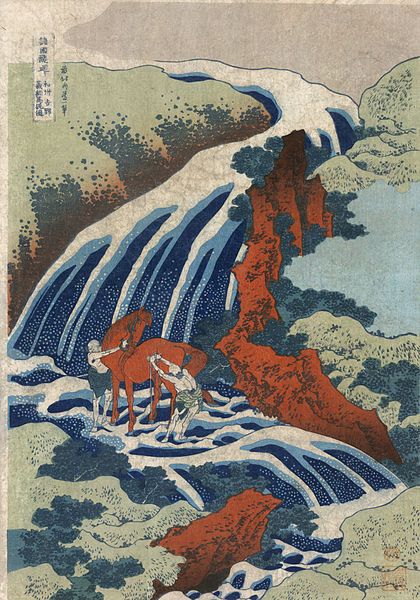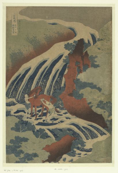 Editor: This is "Yoshitsune's Horse-washing Falls at Yoshino in Yamato Province" by Hokusai, from his "Tour of Waterfalls" series. I am struck by how the waterfall dominates the scene, almost dwarfing the figures. What can you tell me about the significance of this imagery? Curator: Hokusai isn’t simply depicting a waterfall; he's placing Yoshitsune, a legendary historical figure, within a dramatic landscape. Consider how landscape prints were consumed: they shaped national identity and linked viewers to heroic narratives. How does this image play into the public's perception of Yoshitsune and his exploits? Editor: That's fascinating! So, the print serves a dual purpose: appreciating nature and reinforcing cultural narratives. It makes me rethink the power of landscape art. Curator: Precisely. By understanding the historical and cultural context, we can interpret the art's deeper meaning and its impact on society.