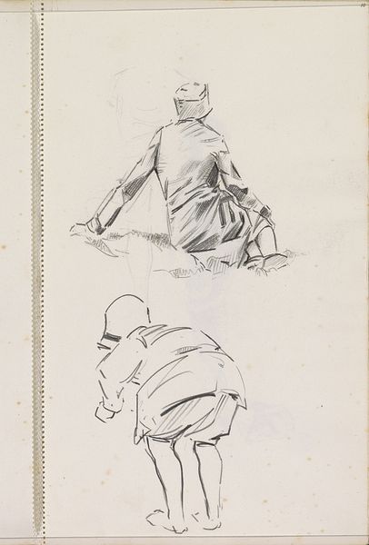 Rembrandt van Rijn made this sketch of two women and a man using pen and brown ink on paper. Consider the immediacy of the material, how the fluidity of ink allows for quick, spontaneous marks. The thinness of the lines creates a sense of lightness, but also reveals the artist’s confidence. Pen and ink is a common tool, but in Rembrandt’s hands, it becomes something more. Think about the relationship between the artist and the subject. The quick, loose strokes suggest a casual observation, a fleeting moment captured on paper. Rembrandt isn't just representing figures; he's conveying a sense of life and movement, a social dynamic. The figures, likely ordinary people encountered in daily life, are elevated through Rembrandt's skilled rendering. This sketch reminds us that even the simplest materials, when wielded with mastery, can transcend their everyday nature and offer profound insights into the human condition. It challenges the traditional hierarchy between finished artwork and preliminary sketch, reminding us to appreciate the skill and intention behind every mark.