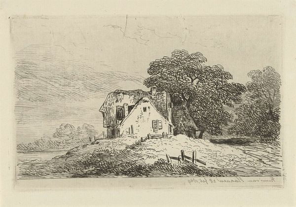 Johannes Pieter van Wisselingh created this small etching titled 'Coastal Landscape with Ruins' using fine lines to convey a sense of delicate atmosphere. The composition is structured around the contrast between the detailed foreground and the softly rendered background. Notice how the ruins are centrally positioned. Their solid form anchors the composition, while the surrounding landscape dissolves into lighter tones. The use of line—short, repetitive strokes—creates a sense of texture. Simultaneously, this technique blurs the distinction between the solid architecture and the natural forms of the trees and clouds. The composition draws on the Romantic tradition, where ruins symbolize the passage of time. Consider the small figures in the foreground. They are dwarfed by the architecture, which may evoke a feeling of human insignificance against the backdrop of history and nature. Wisselingh uses the etching medium to invite contemplation on themes of decay and the sublime.