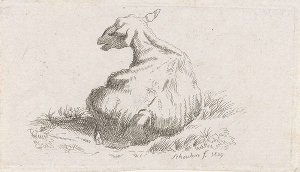 Editor: This ink drawing, “Liegende Ziege nach rechts, rückansichtig,” or "Lying Goat facing right, seen from the back," is by Friedrich Wilhelm Hirt and held in the Städel Museum. The level of detail feels surprising for a study; what do you see here, in terms of its cultural context? Curator: Well, consider how representations of animals shifted over time. In earlier periods, they often symbolized broader allegorical or religious concepts. By Hirt's time, though without a specific date on this, there's an increasing interest in realism, fueled by scientific observation. The very existence of museum collections shaped the creation of studies like this; academic collections fostered objective studies. What function might this detailed representation serve in that kind of institutional environment? Editor: I suppose it could be used as a reference, a model for other works, maybe even something for students to learn from? Was there also, perhaps, a growing interest in rural life at the time? Curator: Exactly! The emerging romanticism of the era celebrated the pastoral, the 'natural' world as a counterpoint to industrializing society. Even something as simple as depicting a goat became infused with these social anxieties and yearnings. The value placed on untouched wilderness reflects an ideological desire that is as manufactured as it is 'natural'. Editor: So, it’s not *just* a goat – it’s a statement. Curator: Precisely. The drawing, exhibited and studied, contributes to broader dialogues around nature, society, and artistic practice, doesn't it? Museums create meaning by placing objects into conversation. Editor: That's a really helpful perspective. I was just seeing a drawing of a goat, but you’ve highlighted its potential to signify something much bigger. Curator: Glad to broaden the view. Understanding how institutions influence our interpretations helps unlock so much within art history.