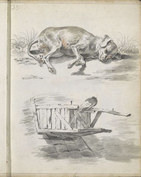 Curator: We're looking at a lithograph titled "De Jaguaar" from circa 1894-1959, attributed to Gordinne, found in the Rijksmuseum collection. Editor: My immediate thought? This feels surprisingly gentle. Given the subject, I was expecting something more overtly fierce, but there's a calmness to it. The landscape is soft, the colors muted... it's a rather docile scene. Curator: That gentleness, I think, reflects its original function, perhaps as a didactic image or popular print meant for mass consumption. Note how the surrounding inscription styles the animal to the exotic. It would shape colonial perceptions of exotic wildlife, making them seem less threatening, maybe even romanticizing their place in a distant, unfamiliar world. Editor: You're right, it does romanticize it. And consider the iconography: the jaguar, in many cultures, is a symbol of power, of the unknown, and often of death and rebirth. Yet here, it's presented almost like a domestic cat, albeit one with a kill. That contrast is quite telling. This juxtaposition dilutes some of the traditionally darker symbolisms attached to jaguars. Curator: Exactly! By domesticating the image, it made the concept of the jaguar – and by extension, the 'wild' lands where they reside – more palatable for European audiences. It reduces the power that these indigenous images and landscapes might have had. Editor: There is the landscape behind too. Although simplistic, the landscape in itself adds symbolic layers. Water, suggesting life and passage; distant hills invoking the unknown journey ahead. I almost want to say it recalls journeys, be they geographical or spiritual. Curator: That's an astute observation. Even in a seemingly straightforward depiction, there are complex social and symbolic histories layered within the imagery. It represents a period, class, and ideology with ease. Editor: I find it interesting that an image intended for broad distribution contains so much to unpack now, a century or more later. Curator: It certainly gives you pause to think about how these historical prints were received and what socio-political statements are imbedded in their representation.