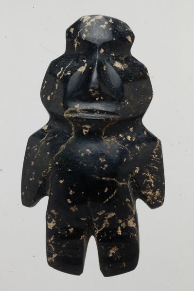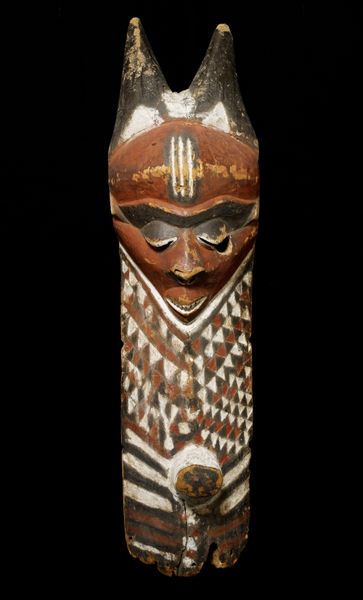 Curator: Well, hello there! We’re standing before a captivating sculpture: an African mask, carved from wood, believed to originate from the 19th century. Editor: My first thought? Playful. There’s something about that wide, toothy grin. It feels like this mask might have stories and some mischievous ones. Curator: Precisely! The formal composition is striking. The carver's skilled hand gave it slightly protruding eyes that suggest a depth of vision. Then there’s that patterned headdress – look closely at the craftsmanship there, it offers some kind of semiotic key perhaps? Editor: Key? Hmm, more like a quirky hat! To me, that headgear resembles some kind of brain coral, and those teeth! They remind me of pickets of fence at the scariest house at the end of the block that had a wild-looking dog and I had to walk to school there every day when I was seven. The anonymity around its creation somehow adds to the mystery; don't you agree? Curator: Indeed! Considering the likely cultural context in which this African mask was produced and ultimately used is crucial. African masks typically serve integral roles in ceremonial, spiritual, or social functions. Its specific community use, origin or intended meaning remain fascinating open questions. Editor: Well, whatever its history, there's a definite expressiveness. Do you suppose the artisan who fashioned it intended to capture something more profound? Maybe joy? The unknown provenance does set my imagination alight and that contrast of light and dark wood creates a striking composition! Curator: Most certainly. By attending to this anonymous artist's treatment of form, one can truly perceive both intention and affect. Editor: The layers and depth of detail are revealed with continued looking. Makes one question the idea of any simple notion of ‘masking’ or simplicity – as the artist had much to show us about human feelings. Curator: Quite so. Hopefully, visitors seeing "Mask" take away some measure of their own thoughtful exploration!