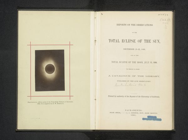 Curator: Looking at these photographic prints depicting the sun's corona during a total solar eclipse, taken around 1869 by Albert Schutze, what strikes you first? Editor: The stark contrast! A solid black disc ringed by the delicate, almost ethereal corona. It's visually arresting. It seems so fragile somehow, this blinding light rendered into grayscale and contained within the limits of a photograph. Curator: It's quite evocative, isn't it? These images were likely produced and distributed as scientific documentation, to capture what the human eye alone could not easily retain. Photography was a vital tool in solidifying the image of scientific authority and distributing knowledge. Note the four distinct renderings—different photographic processes capturing subtle variations. Editor: Right, these weren’t simply artistic endeavours; the medium itself – photography – carries the weight of scientific credibility and empirical observation. You have to wonder about the equipment used, the collodion process, the lengths the scientists would have gone. What about the availability of material to make this kind of capture? Curator: Indeed, thinking about these images in relation to the history of photographic production expands the context. These are more than mere celestial images; they are historical artifacts imbued with labor and social context of 19th-century scientific pursuits. They're mass produced using photographic printing techniques. Consider also the consumption of knowledge as a status signifier in that era, perhaps? Editor: That's interesting. Looking closely, there are inscriptions, dates and names beneath each image suggesting careful annotations, which further embeds the role of the scientist as objective recorder. Each image seems almost identical until closer inspection of each individual treatment and printing technique reveals new observations to the scientific eye, adding or omitting visual elements with great deliberation. It adds another layer of nuance, highlighting their analytical perspective through material choices. Curator: The way science translated abstract, astronomical events into something that could be observed and analyzed is rather extraordinary to consider even now. These mass printed photographs allowed knowledge to become democratized and accessible, as well as opening up access to the spectacle of these moments in science’s infancy. Editor: Well, thinking through it again has certainly offered new dimensions to that initial experience of awe; thinking about materiality gives the images more layers than initial inspection suggested! Curator: For me, viewing scientific advancement through artistic means only heightens how scientific knowledge came to affect not only industry, but public perception itself during this transformational period of photographic advancements.