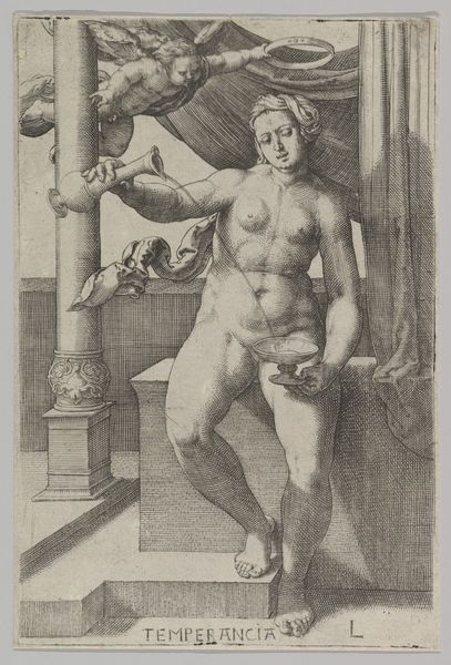 Editor: Here we have Bonasone's "Musica," an engraving from 1544, currently housed in the Rijksmuseum. I'm struck by how all these musical instruments are clustered around a nude female figure. What can you tell me about the imagery at play here? Curator: It's fascinating to consider how the arts, particularly music, were visually represented during the Renaissance. This engraving reflects a renewed interest in classical antiquity. Consider how the nude figure embodies an idealized form, referencing Greek and Roman sculptures, while the instruments symbolize the harmony and order believed to govern the universe. This image also makes me wonder, what socio-political function might idealized representations of Musica serve? Editor: You mention idealized forms and order. Is this then linked to the function of art in the public space during this time? Curator: Precisely. Public art, especially engravings and prints that could be widely distributed, were instruments for disseminating knowledge and shaping public perception. Figures like "Musica" served to elevate music to a level of intellectual and moral significance. How do you think the nudity impacts its public perception at the time, compared to today? Editor: I would imagine the nudity connected it more explicitly to classical ideals of beauty, but might have limited its circulation in some social spheres due to the sensibilities of the period. What I take away from this work is how public art could reinforce ideas of beauty, intellect, and order at the same time. Curator: Exactly! The Italian Renaissance saw the convergence of art, science, and politics, using powerful imagery to convey specific messages and cultural values. It really highlights how the meaning and function of art are always historically and socially situated.