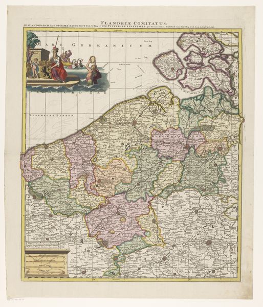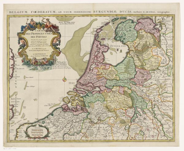 Curator: Immediately, the intricacy impresses. The density of detail is remarkable; I'm drawn in. Editor: Indeed! What we're looking at here is a pre-1700 engraving known as "Kaart van de Zeventien Provinciën," or Map of the Seventeen Provinces, by Gerard Valck, currently held in the Rijksmuseum's collection. It exemplifies the Dutch Golden Age's cartographic prowess. Curator: Precisely. Observe how the line work defines not just geographical boundaries but also texture and relief. Notice, too, the Baroque influence, a dynamic energy captured through elaborate ornamentation and figurative elements, which disrupts the potential monotony of purely functional mapmaking. Editor: It's a product of its time; these embellishments aren't just decoration. Cartography held significant political and economic weight in the 17th century. The detailed depiction of cities, waterways, and trade routes served to solidify Dutch power and project authority, even incorporating classicized allegorical figures within the ornamental title cartouche to further enhance the sense of national grandeur. Curator: I see that, though I can't ignore how the colors – subtle though they are – establish zones, structuring the composition while simultaneously delineating the provinces from one another. It provides both order and clarity, but is the coloring accurate or idealized, a deliberate construct to shape perception? Editor: Accuracy in maps from this era can be rather flexible, molded by political priorities, though it is not meant to fully deviate from its intended geographic portrayal. Its role lies not merely in truthful documentation, but in visualizing aspirations of control, trade, and cultural relevance for the Dutch Republic on the international stage. Valck’s artistry contributes greatly in cementing such political and cultural relevance. Curator: True, and Valck uses formal choices, specifically with coloration and figuration, to contribute a unique lens that transforms data into propaganda. In observing and appreciating, this shifts my analysis of what truth really constitutes. Editor: A valuable observation. Looking at the piece through both lenses provides richer insight to how societal impact influences artistic interpretations, past and present.
