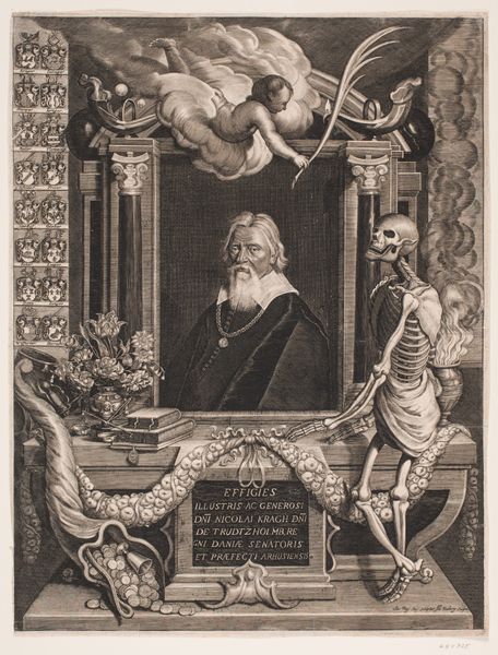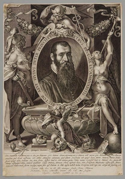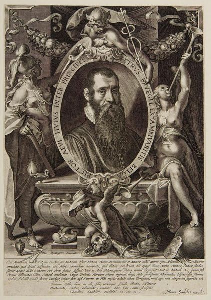 Curator: This engraving, dating back to 1606, offers us a glimpse of Pieter Brueghel the Younger as seen through the eyes of Aegidius Sadeler II. It resides here at the Metropolitan Museum. Editor: Intensely theatrical. It’s as if the artist is performing a Breughel—and I mean that as a compliment. The allegorical figures surrounding the portrait feel staged and… self-conscious in their drama. Curator: It's quite common for artists of the era to situate their subjects in elaborate frames, with objects relating to the subject’s trade and place among society. I find this portrait’s use of ornamentation so exuberant and the allegorical frame almost fighting for center stage. Editor: Note the contrast. The stern, unflinching face of Brueghel sits within a swirling eddy of objects. The skull and the cherubs both seem to be wrestling for his attention. Is this intended as an exploration of what shaped his art? Look how this engraving medium works: notice the use of cross-hatching which feels laborious in all the ways his paintings, I imagine, were as well. Curator: Absolutely. This engraving encapsulates that moment. There is that very controlled chaos you pinpoint, but within Brueghel’s composed, penetrating gaze – his face is almost photorealistic by contrast, yet still warm with emotion. And what about those wonderful flourishes, those trumpeting angels, bearing witness? Editor: Exactly. And observe that the engraver is playing a dangerous game: How do you frame an artist known for framing reality? Brueghel's unflinching commitment to his subject, yes, but filtered through his precise brushstrokes and the very act of committing this artmaking is what's foregrounded, from conception to consumption. It forces us to think about this whole process! Curator: I see it as a powerful commentary on the nature of artistic legacy. In the end, this isn't merely a portrait, but an unveiling. An almost intimate introduction of an artist by an artist, translated by yet another artist, spanning the ages and inviting us in, right here, today. Editor: Well said! For me, this is more than a picture – it is a testament to how artistry labors, from sketch to execution to consumption, constantly reshaped by material forces, and always revealing something new.