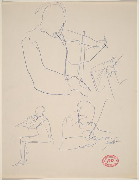 Curator: This is an untitled drawing by Richard Diebenkorn, created sometime between 1955 and 1967. It depicts a woman reclining, her knees raised, seemingly engrossed in a book. The medium is simple: pencil on paper. Editor: It’s strikingly intimate, isn’t it? The loose, almost gestural lines create a sense of immediacy, as if we're catching a private moment of contemplation. There is also a certain vulnerability about the way her face is rendered. Curator: I think Diebenkorn's broader body of work is relevant. His work during this period explored domestic scenes, but he was doing that in the shadow of abstract expressionism which certainly elevates even what might seem ordinary. How does his approach, and how would that speak to women's issues at this time? Editor: I think situating it within the context of abstract expressionism is helpful; however, it can run the risk of obscuring its exploration of women's identity. After all, figuration can be interpreted as its own statement, distinct from the dominant abstract style. To that end, a drawing of a woman relaxing, perhaps defying traditional societal roles assigned to her, has a political nuance worth emphasizing, no? Curator: Perhaps, but I see this as participating in the broader development of modernist ideas about women. By making this woman reading at its core, rather than commenting on a specific politic or stance of women, I would argue the artist is exploring new concepts and positions on them. So in the grand scheme of history and in museums, one should consider its ties to other "sleeping" nudes or other figurative, feminine studies during the time period. Editor: I suppose it boils down to perspective then. Viewing the image as a straightforward drawing that emphasizes style overlooks the cultural context. Instead of just form, what does the intimate moment communicate in regards to the construction of the feminine? To ignore this question dismisses critical engagement of art history with intersectionality, as you might say. Curator: Well said. Art offers these open questions and interpretations, it's wonderful to continue thinking critically about works like this today. Editor: Precisely. Each engagement peels away yet another layer of understanding, even years after its creation.