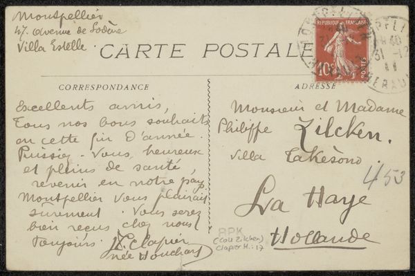 Curator: Before us we have “Prentbriefkaart aan Philip Zilcken,” a postcard sent before 1921. It's an ink drawing on paper. Editor: It's got that cozy feel, doesn't it? Like stumbling upon a sweet little note tucked away in an old book. The penmanship dances across the paper. Curator: Indeed. Note the considered composition. The sender uses the space effectively. Observe how the scripted message counterbalances the address, both framing the central void of the postcard. Editor: Void? I see potential. It feels open. All that empty space screams potential for daydreams, maybe for imagining a reply from Philip. It almost begs to be touched and smudged with stories! Curator: Your point is valid but a reading based on materiality could consider paper and ink as significant compositional factors that highlight its inherent qualities and textures in the artistic whole. Note the contrast between thick and thin lines to convey tonal depth. Editor: You're right, that attention to texture does give it a real tactile feel. Imagine holding it in your hands and how the ink might subtly resist. And the choice of ink evokes something so timeless. It makes the handwritten sentiments feel incredibly precious, somehow. Curator: This connects to the artist’s use of calligraphy, with letterforms executed with purpose. Each curve and stroke embodies cultural meanings. Editor: Exactly! And those swooping loops practically beg for interpretation—it is so human and heartfelt. Curator: Agreed. While I examined the sender's deliberate pen strokes as a study in script, your perspective has prompted an acknowledgement of the emotional qualities inherent in this "Prentbriefkaart aan Philip Zilcken”. Editor: And you reminded me to appreciate the pure elegance in a single line drawn with purpose. A lovely meeting of perspectives.
