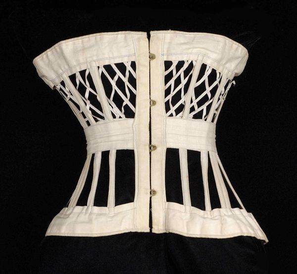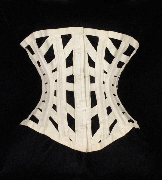 This ‘Corset’ was made by the Royal Worcester Corset Company. Although the exact date is unknown, the object’s form and construction techniques firmly place its production somewhere between 1861 and 1950. What strikes us first is the contrast between the stark white vertical bands and the dark fabric, a visual tension that sculpts the object into a symbol of structured form. The corset, traditionally a tool of body modification, here becomes a study in lines and planes. The structure is segmented into rigorous vertical lines and a laced central panel. These elements work to both reveal and conceal, suggesting a complex interplay between visibility and constraint. Consider how the object, through its very design, challenges our perceptions of the body. It destabilizes conventional meanings of form and beauty. What we are left with is not merely an undergarment, but a cultural artifact rich in symbolism.