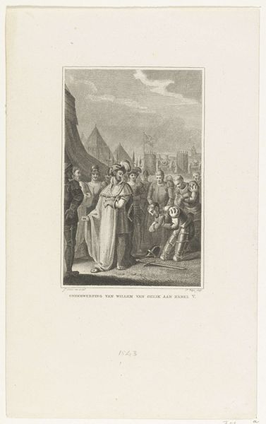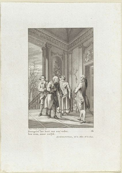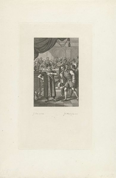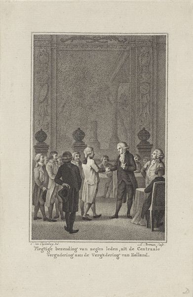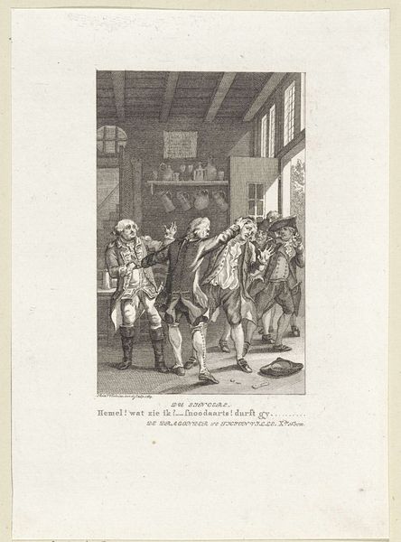 Curator: This stark scene before us is an etching and engraving titled "Man wordt door soldaten van zijn bed gelicht," or "Man dragged from his bed by soldiers" by Reinier Vinkeles, created around 1790. Editor: The drama leaps out immediately. The harsh light from the torches, the bed curtains, the very act… it speaks of vulnerability violated. Curator: The high contrast of light and shadow is characteristic of the Neoclassical movement, lending an air of moral weightiness to the event. This engraving reflects a particular trend in narrative art from this period. Editor: The symbolic content is inescapable: we have the citizen rudely awakened from his slumber, dragged, really, into the harsh light of… what exactly? What’s the implied meaning behind this abrupt intrusion? Curator: These 'genre' scenes of everyday life also carry potent socio-political weight. It was produced at a time of revolution, globally. One reading may suggest the disruption of domestic life by the heavy hand of the state. There are strong lines, almost brutal ones, that speak to this. Editor: Exactly, but in what sense? Are these soldiers upholding justice or enacting tyranny? Their faces remain obscured. Is this perhaps an allegory about state power, or the power of figures hiding under anonymity? The lantern looming overhead also strikes me: justice watching perhaps? Curator: Possibly both, given the era. This speaks to the way museums and cultural institutions have power in framing what gets created and how these ideas get perpetuated. Notice how Vinkeles’s use of line in the shading intensifies the feeling of chaos, highlighting this power play. The viewer is forced to consider who holds it, and to what end. Editor: Yes, an ambiguity that mirrors real-world anxieties then and now. Looking again at how those light sources draw the eye - it almost transforms into a psychological study of power relations and their consequences on a personal scale. Curator: I think you've touched on the essence of what Vinkeles was exploring: this artwork serves as a reminder that even domestic spaces can be battlegrounds for larger societal conflicts. Editor: Precisely. What appears as a simple etching is, in truth, a deeply layered reflection on political violence and resistance.