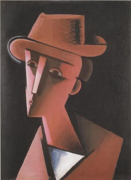 Curator: At first glance, Metzinger's "Portrait of Albert Gleizes" from 1912 overwhelms me with its deconstructed planes. What is your initial impression? Editor: I'm struck by the material density, all those planes and edges layered with visible brushstrokes. You can almost feel the thickness of the oil paint. What’s he trying to do, take the very stuff of painting and turn it into a representation of… another painter? Curator: Indeed! This work, an oil painting from the height of Cubism, presents Gleizes, also a painter, as a series of fractured forms. It is about the multiple perspectives contained in a single view, influenced by developments in scientific understanding of time and space. Editor: So it's not about faithful representation, but more like an accumulation of impressions…I see how the dark colors—grays, blacks, browns—give the figure a sculptural quality, like a monument almost. Was there an ambition here to solidify the status of the artist? Curator: That’s a perceptive point. In this Cubist framework, elements carry weight symbolically. The hat, the suit, rendered in such somber tones, speaks to the societal role, the intellectual seriousness these artists were claiming for themselves. The monochrome palette is almost devotional in its restraint. Editor: And yet, it's a manufactured solemnity, isn’t it? The visible labour, all those calculated brushstrokes, betray the artificiality of it all. One feels the process as much as the final image. There’s almost a tension there—between the desire to ennoble, and the actual physicality of creating an image. Curator: Absolutely. Consider the fracturing not just as a stylistic choice but as a means of dismantling traditional portraiture's focus on surface and presenting a multifaceted internal state. He wasn't painting Gleizes the person; he was conveying something essential about his intellect and position within a new cultural movement. Editor: Looking closer, there's such deliberate awkwardness. This dismantling of form feels deeply material—a forceful arrangement and rearrangement of paint into recognizable shape. In some sense, it suggests the violent break of Modernism away from established modes. Curator: Precisely. Looking at the figure and geometry in unison allows me to understand the revolutionary spirit not just visually but intellectually. The painting then isn't merely a portrait, but a manifesto. Editor: A potent demonstration, wouldn’t you say, of how artistic vision is shaped by its own production, and in turn, shapes the cultural landscape it occupies.