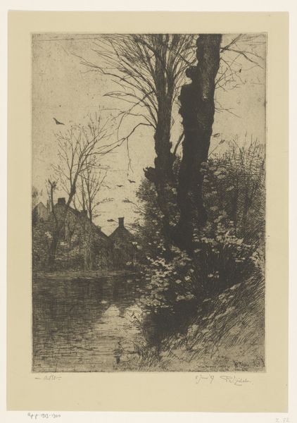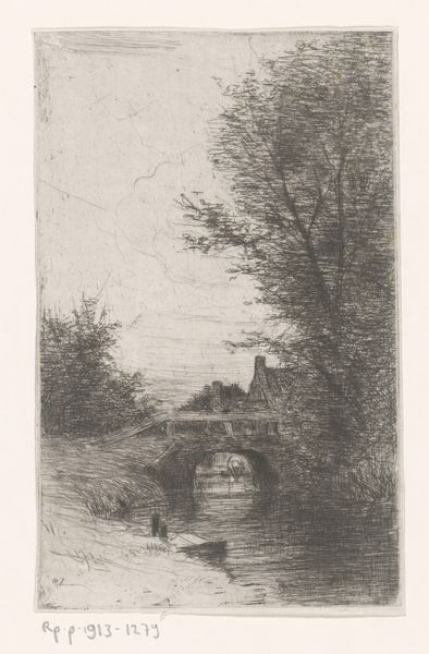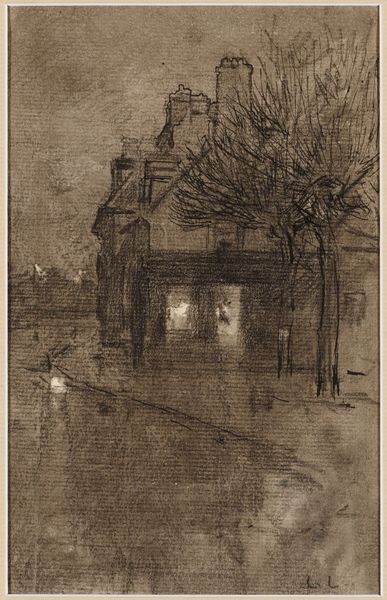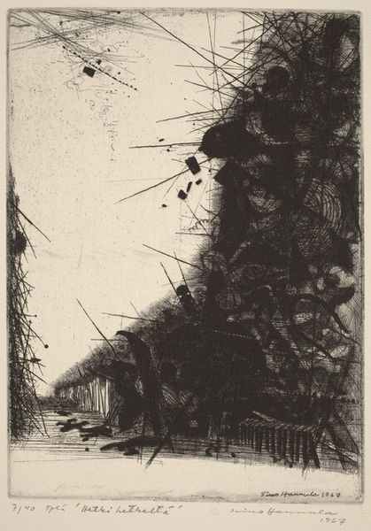 Curator: Looking at this etching, titled "Inverleith," made by James McBey around 1904 or 1905, what's your immediate response? Editor: It evokes a somber mood, definitely melancholic. The composition, with the rain-slicked street and blurred figures, gives the impression of transience, almost like a faded memory. Curator: The use of etching to portray an urban landscape is itself significant. McBey uses these tiny lines to show details about this area in Edinburgh in a quick style, reminiscent of a photograph in the rain. The style here, while precise, falls loosely within an impressionist tradition, favoring fleeting moments over rigid accuracy. What’s interesting to you, socially or politically, about this image? Editor: Well, think of the rise of urbanization in the early 20th century. You see how cityscapes themselves were transformed into art. McBey wasn’t just capturing a scene; he was contributing to the visual language defining the modern urban experience. Also, note the prominent telephone pole. Infrastructure became not only part of daily life, but was featured within the artwork. I do wonder, however, if those who live there feel about the telephone pole. Perhaps its a representation of authority looming overhead? Curator: Good points. Consider the symbolism inherent in these technologies of connection contrasted with the individual, somewhat isolated figures walking along the street. Does it underscore or mitigate alienation in this environment? McBey seems fascinated with those liminal spaces between public infrastructure and the anonymous masses. This print shows an emerging cultural landscape. The mood suggests that he could sense changes in perception during modernity. Editor: I would be curious what the town residents felt about it. Were they interested in having telephone lines everywhere, or did they see it as a necessary component for participating in contemporary society. That being said, it is a striking image. It's not overtly political, yet it subtly prompts questions about the individual within a rapidly changing, industrialized society. Curator: A fantastic observation. McBey's ability to create such resonance from what appears at first to be a simple urban scene is impressive. Editor: Exactly, and it prompts us to consider our relationship to those same themes today – urbanization, technology, and the quest to find individual space.