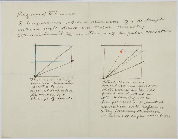 Curator: This is Stuart Davis's "Angle Theory Diagram," currently residing at the Harvard Art Museums. It appears to be a study of form. Editor: It strikes me as a visual manifesto, all angles and intentions. I see both the rationality and the restless seeking in the lines. Curator: Precisely. Davis, known for his abstract compositions, seems to be dissecting how we perceive the visual, breaking it down into its component angles. Notice the handwritten annotations. Editor: They’re fascinating! The drawing almost becomes a symbolic map of Davis's thought process. I wonder about the significance of the red and blue lines, as if charting emotional currents. Curator: Perhaps they represent different facets of his artistic approach. The geometric precision suggests a yearning for order amid the chaos of modern life. Editor: I find such raw vulnerability compelling. It reminds me that even the most intellectual pursuits are fueled by a primal desire to connect with something greater.