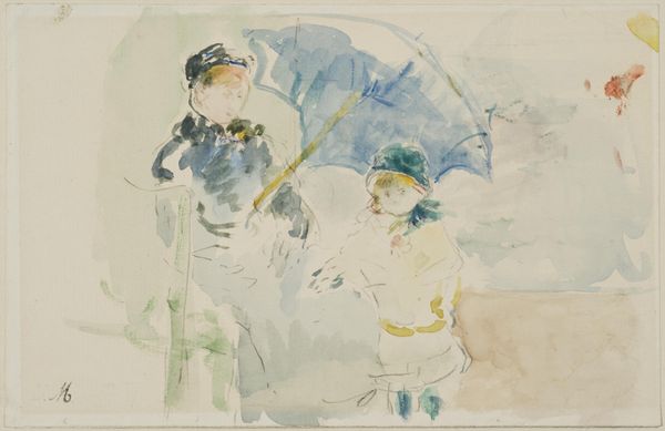 Editor: Here we have Maurice Prendergast's "Along the Boulevard," a watercolor painting circa 1894. There's something immediately charming about its breezy, almost blurry quality. What captures your eye when you look at this piece? Curator: Ah, Prendergast. He was like a visual poet, wasn’t he? What catches my eye is that sense of fleeting moment. It’s like he’s not just painting figures, but the very atmosphere of a Parisian boulevard. Notice how he’s used the watercolor. Loose washes of colour suggest rather than define the forms. It almost dissolves, doesn’t it? The carriages in the back…they could almost be mirages! What do you think of that sketch-like quality? Editor: It makes it feel so immediate, like a snapshot. Less about capturing details and more about conveying an impression, like, the impression of a memory. Curator: Precisely. He's more interested in capturing that sensory experience rather than photographic realism. Also, have you ever felt that peculiar urge to turn away as someone passes, almost shielding from recognition? Editor: You mean like when you almost see someone you know in public and suddenly have to pretend to be on your phone? Yeah. Is that connected to the work? Curator: I am saying he’s created this very sense that we’re glimpsing these figures only for a brief moment. It adds a layer of intimacy, a shared secret, wouldn't you agree? A private understanding between the viewer and the scene unfolding. It seems it doesn’t try too hard, even carefree; maybe a moment where no one is expected to solve the equation to existence. Editor: That makes me look at it completely differently, almost like peeking through a window into a memory. I initially saw it as just an Impressionistic snapshot, but now it feels like a really personal moment that’s captured. Thank you! Curator: Absolutely! These kinds of artworks are here so we can use them and share how we experience them, personally and with each other.