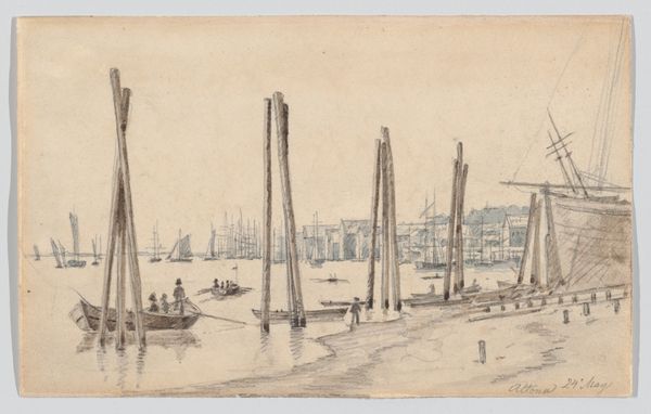 Pieter van Loon sketched ‘Aan de Nieuwestadsherberg te Amsterdam’ using graphite, capturing a lively dock scene. The steamboat, billowing smoke, symbolizes progress, yet its verticality echoes ancient obelisks— markers of power and permanence. The clustered figures on the dock, rendered with minimal detail, evoke the masses seen in Renaissance battle scenes, albeit now engaged in commerce rather than conflict. Consider the lone rower in the foreground; his small boat is a motif found in various cultures, symbolizing journeys— both literal and spiritual. The dockside structures, though utilitarian, remind us of classical porticos, gateways to new worlds and opportunities. The churning smoke juxtaposed with the still water creates a tension, reflecting humanity's perpetual dance between innovation and nature. These echoes of past and present invite us to reflect on the cyclical nature of history.