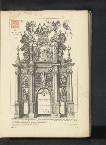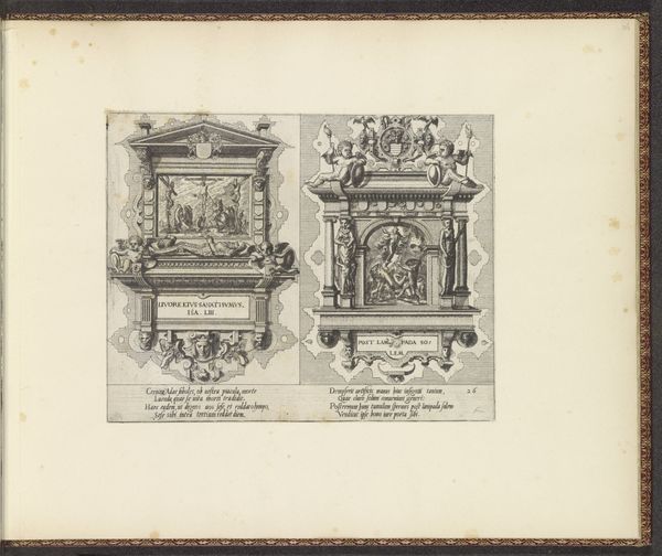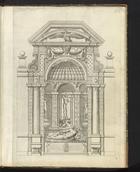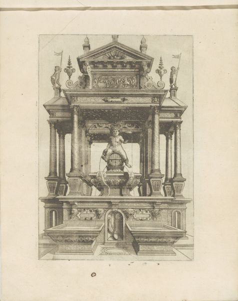 Editor: So, this engraving from 1563 by Johannes or Lucas van Doetechum is called "Architectonisch grafmonument met Petrus," or "Architectural tomb monument with Peter." The sheer scale of this imagined monument is really striking! It looks so grand, even in print. What leaps out at you when you see this? Curator: Ah, a monument for the ages! It certainly *feels* grand, doesn't it? Beyond the obvious classical elements – the columns, the pediment – I’m struck by the idea of memory and its architectural representation. Imagine, if you will, wandering through a Renaissance city and stumbling upon this very sight. Would it prompt introspection? A rumination on faith and history? And what, perhaps, does the artistry reveal about those ideals and values during the 16th century? Editor: That's a lovely way to look at it. So, do you think that the monument’s classical architecture emphasizes a connection with a more ancient or idealized past? Curator: Precisely. It's as though the artist is deliberately intertwining Peter's legacy with the enduring power of Roman ideals, offering a sense of timeless importance. Consider those figures standing guard...they’re less like mourning cherubs, and more like stalwart witnesses, planted there through time itself. What does *that* choice evoke for you? Editor: Hmm… maybe that even in death, Peter's influence is still active and potent, always remembered. I hadn’t considered that those figures were "witnesses". It makes you wonder how intentional every single one of these details must have been! Curator: Exactly! This print truly showcases a journey through the history and beliefs embedded within a culture. A small print but brimming with meaning. Editor: I'm going to be spending way more time examining all of these elements when I visit the Rijksmuseum next week. Curator: As am I. I'll meet you there.